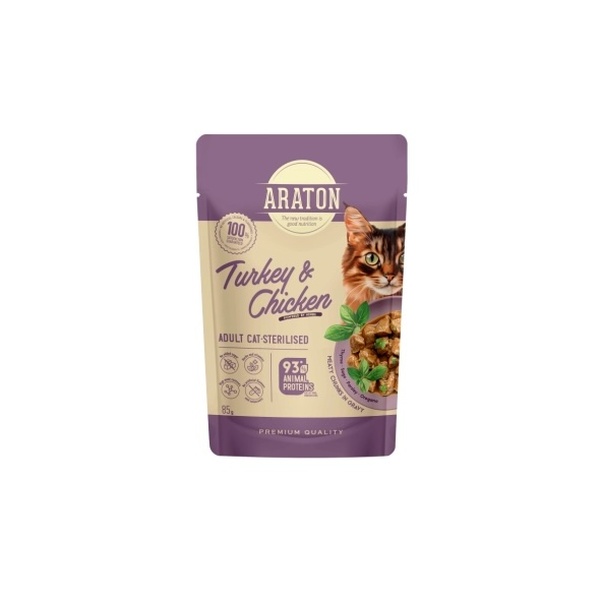 Po sterilizaciji se metabolizem upočasni, apetit pa pogosto poveča, kar pri mačkah lahko vodi v prekomerno telesno težo. ARATON Sterilised je zasnovan tako, da pomaga ohranjati zdravo telesno težo brez odrekanja. Kombinacija pustega purana in lahko prebavljivega piščanca zagotavlja nasitnost z manj kalorijami, hkrati pa ohranja mišični tonus.