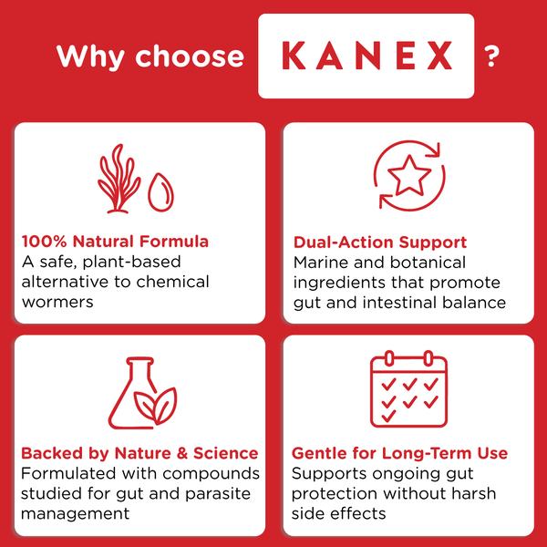 Kombinacija rdečih morskih alg in ekoloških bučnih semen vsebuje naravne učinkovine, kot sta kainska kislina in cucurbitacin, ki pomagata ustvarjati okolje, manj ugodno za razvoj črevesnih zajedavcev ter podpirata njihovo naravno izločanje iz telesa.