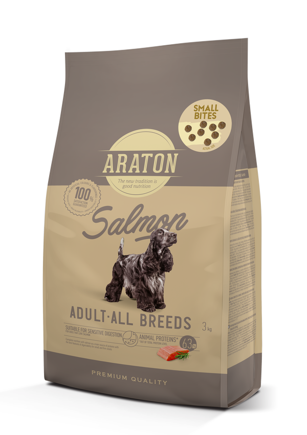 Pasja hrana ARATON Adult Salmon je primerna za vse odrasle pse ne glede na pasmo, še posebej pa se obnese pri občutljivih kosmatincih in alergikih. Losos je nasploh znana kot lahko prebavljiv, hipoalergen vir mesa, ostale sestavine pa še dodatno prispevajo k boljši prebavi in sijoči dlaki.