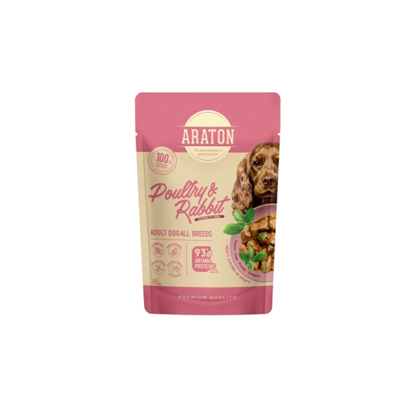 Mokra hrana ARATON vsebuje kar 78 % živalskih sestavin, med njimi visoko prebavljivo perutnino in zajčje meso. Obe vrsti beljakovin se odlično dopolnjujeta in sta nežni do želodca, obenem pa bogati s hranili, ki pripomorejo k vzdrževanju mišične mase in energije odraslih psov.
