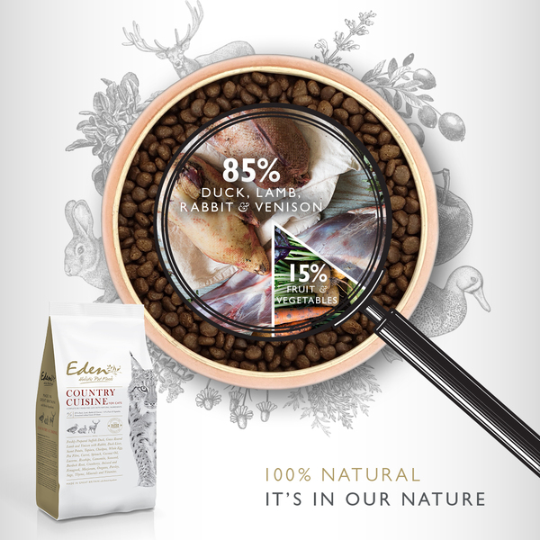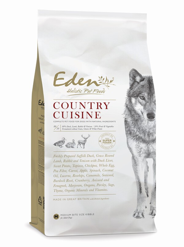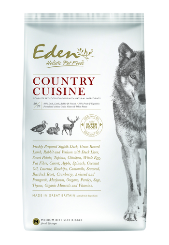Eden Pet Foods Country cuisine je prehransko uravnotežena hrana ki ne potrebuje dodajanja prehranskih dopolnil. Vsebuje kakovostne tradicionalno rejeno svežo pripravljeno račko, jagnječje meso, zajca, divjačino in cela jajca. Temelji na prehrani prednikov psov. Vsebuje 34% kakovostnih mesnih beljakovin, vitamine in minerale v kelatni obliki, ki podpirajo naravno ravnovesje telesa in mu nudijo vse potrebno za zdrav razvoj od mladička do odraslega psa.