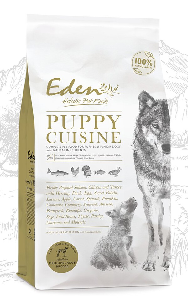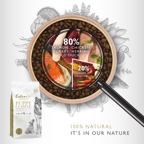 Pasja hrana Eden za mladiče je zasnovana tako, da je usklajena s prehrano prednikov. Vsebuje naravne sestavine, nežno kuhane na pari pri približno 90°C. Način priprave rezultira zelo prebavljivo hrano, ki ohranja maksimalen delež naravnih hranil.