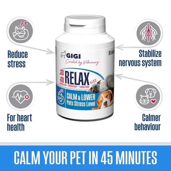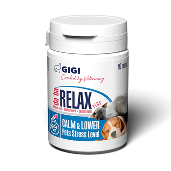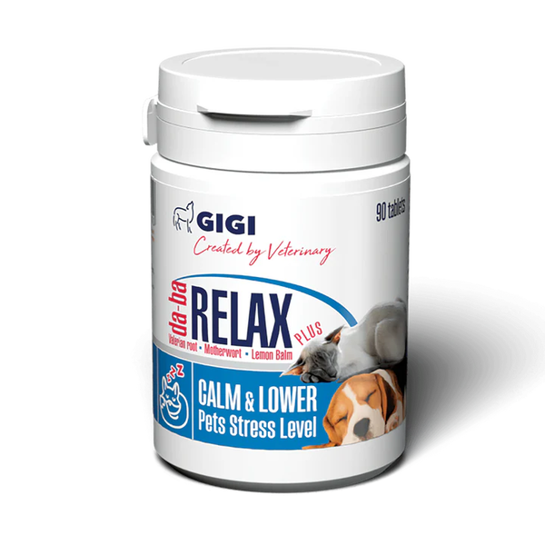 GigiVet da-ba RELAX Plus je naravni prehranski dodatek v obliki okusnih tablet, zasnovan za zmanjšanje stresa, tesnobe in nemira pri psih in mačkah. Vsebuje kombinacijo preizkušenih rastlinskih izvlečkov, obogatenih z magnezijem in vitamini skupine B (B1 in B6), ki skupaj nežno podpirajo delovanje živčnega sistema, brez tveganja za zaspanost ali odvisnost.
