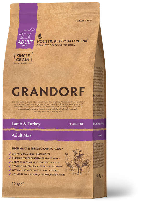 Grandorf Lamb & Turkey Maxi je ustvarjena posebej za velike pse, ki potrebujejo nežno, a hranljivo prehrano, bodisi zaradi alergij ali občutljive prebave. Vsebuje visok delež purana in jagnjetine, ki sta lahko prebavljiva vira beljakovin in vsebujeta tudi ostala pomembna hranila, ki podpirajo zdravje vašega ljubljenčka.