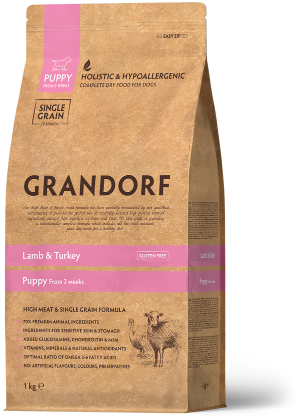 Grandorf Puppy Lamb & Turkey je posebej razvita za mladiče vseh pasem od 3. tedna starosti naprej ter za breje in doječe psičke, ki potrebujejo dodatno energijo, beljakovine in hranila. Hrana nudi vse, kar mladi organizem potrebuje za zdrav razvoj, močan imunski sistem in vitalnost. Vsebuje visok delež purana in jagnjetine, ki sta lahko prebavljiva vira beljakovin in vsebujeta tudi ostala pomembna hranila, ki podpirajo zdravje vašega ljubljenčka.