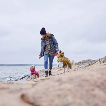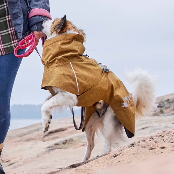 Visok ovratnik preprečuje, da bi voda kapljala pod plašček in tako zmočila vašega psa. Premišljeno zasnovana zadrga s preklopom preprečuje nenamerno cukanje psa oziroma puljenje dlake, obenem pa omogoča hitro oblačenje in slačenje. Zanesljivi, lepljeni šivi preprečujejo vdor vode, peska, blata in druge umazanije. Posebna odprtina nudi enostavno pripenjanje na povodec.