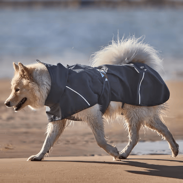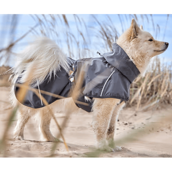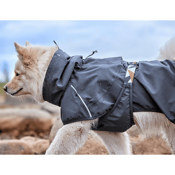 Visok ovratnik je še posebej preprečuje, da bi voda kapljala pod plašček in tako zmočila vašega psa. Premišljeno zasnovana zadrga s preklopom preprečuje nenamerno cukanje psa oziroma puljenje dlake, obenem pa omogoča hitro oblačenje in slačenje. Zanesljivi, lepljeni šivi preprečujejo vdor vode, peska, blata in druge umazanije. Posebna odprtina nudi enostavno pripenjanje na povodec.