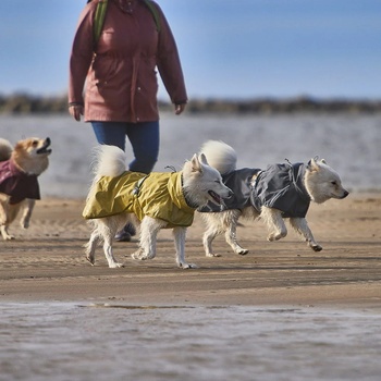 Visok ovratnik preprečuje, da bi voda kapljala pod plašček in tako zmočila vašega psa. Premišljeno zasnovana zadrga s preklopom preprečuje nenamerno cukanje psa oziroma puljenje dlake, obenem pa omogoča hitro oblačenje in slačenje. Zanesljivi, lepljeni šivi preprečujejo vdor vode, peska, blata in druge umazanije. Posebna odprtina nudi enostavno pripenjanje na povodec.