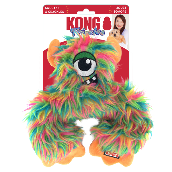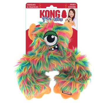 Igrača Kong Frizzles Frazzle je popolna kombinacija mehkobe in zabave. Ustvarjena za pse, ki obožujejo igro, raziskovanje in crkljanje. Igrača ima dolgo, mehko in kosmato plišasto dlako, ki kar vabi k igri, vlečenju ali preprosto k temu, da se pes nanjo nasloni in zadrema.