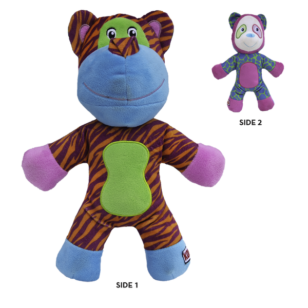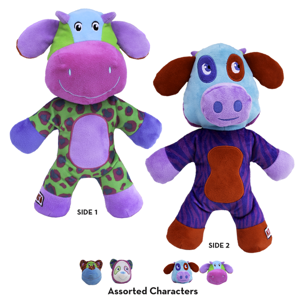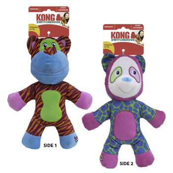 Dvojna igrača za psa Kong Switcheroos nudi neskončno možnosti zabave. Ena igrača v sebi skriva dva različna lika, vsak od njiju pa ima drugačne barve in teksture, zaradi česar je igrača za psa bolj zanimiva od običajnih igrač. Dodatno bo igro popestril tudi piskajoči vložek, ki ga psi naravnost obožujejo.