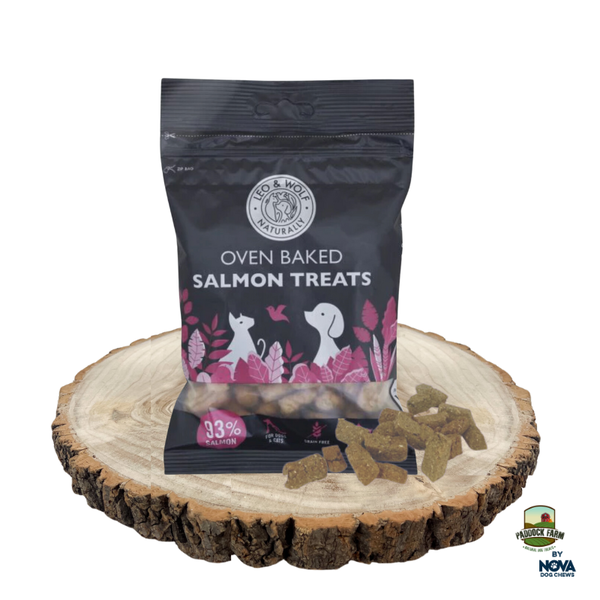 Leo & Wolf Oven Baked Salmon Treats so narejeni iz 93 % lososa, ki je znan po svoji vsebnosti omega-3 maščobnih kislin. Slednje podpirajo zdravo kožo in sijočo dlako, hkrati pa spodbujajo tudi delovanje srca, ožilja, možganov in živčevja. Losos v priboljških je pečen v pečici, s čimer ohranja slasten okus. Kakovost lososa je primerna tudi za človeško prehrano.
