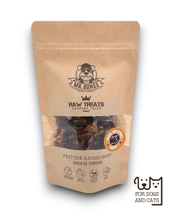 Meso v Mr. Bones Raw Treats Beef prihaja iz španskih provinc Salamanca in Extremadura. S sodelovanjem z lokalnimi kmeti in rejci ne zagotavljamo le najvišje kakovosti surovin, temveč tudi zmanjšujemo ogljični odtis proizvodnje.
