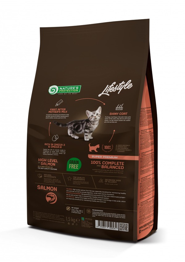 Mačja hrana za mladiče Lifestyle zaradi vsebnosti lososa in lanenih semen predstavlja bogat vir omega-3 maščobnih kislin. Slednje skrbijo za zdravje kože in dlake, krepijo zdravje srca in ožilja ter pripomorejo k razvoju možganov in živčevja. Zaradi lahke prebavljivosti sestavin pa je hrana primerna tudi za občutljive mačke.