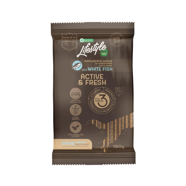 Ustna higiena je eden od temeljev zdravja in dolge življenjske dobe vašega ljubljenčka. Pri tem vam bodo v pomoč dentalne palčke Active & Fresh, ki so namenjene mladim psom. Posebna oblika in sestavine pomagajo odstranjevati zobne obloge, obenem pa preprečujejo razvoj bakterij, ki škodijo zdravju dlesni in povzročajo neprijeten zadah.